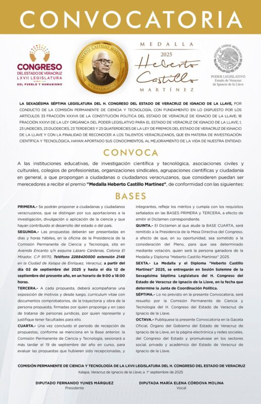 Xalapa, Ver. 03/09/2025.- En cumplimiento de lo dispuesto en la Ley de Premios del estado y para reconocer a los talentos que en materia de investigación científica y tecnológica hayan aportado sus conocimientos al mejoramiento de la vida de Veracruz, el Congreso del Estado, por conducto de la Comisión Permanente de Ciencia y Tecnología, emitió la convocatoria para proponer a personas candidatas a la medalla Heberto Castillo Martínez, edición 2025.