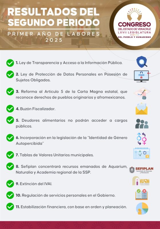 Por otra parte, distinguió la extinción del Instituto Veracruzano de Acceso a la Información y Protección de Datos Personales (IVAI), la disposición para que la Secretaría de Finanzas y Planeación (Sefiplan) concentre los recursos emanados del Aquarium, del Parque Naturalia y de los servicios prestados por la Academia Regional de Seguridad Pública, además la regulación de servicios personales y con respecto a los adeudos heredados. La designación de la ciudadana Stephany Rosas Méndez como Fiscal Anticorrupción del estado y la aprobación del Plan Veracruzano de Desarrollo (PVD), documento rector de las políticas que guiarán el sexenio de la ingeniera Rocío Nahle.