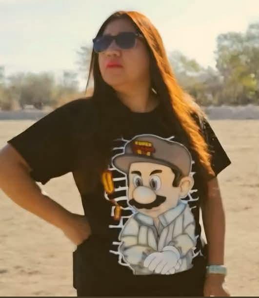 La Paz, BCS. 22/07/25.- Circularon en redes varias fotografías de la Regidora Séptima del H. Ayuntamiento de La Paz, María del Carmen Aguilar, portando una playera estampada con una imagen del personaje de video juegos Mario Bros simulando al Chapo Guzmán, ex líder del Cártel de Sinaloa, que combinados dan como resultado la versión del “Super Chapo Bros”.