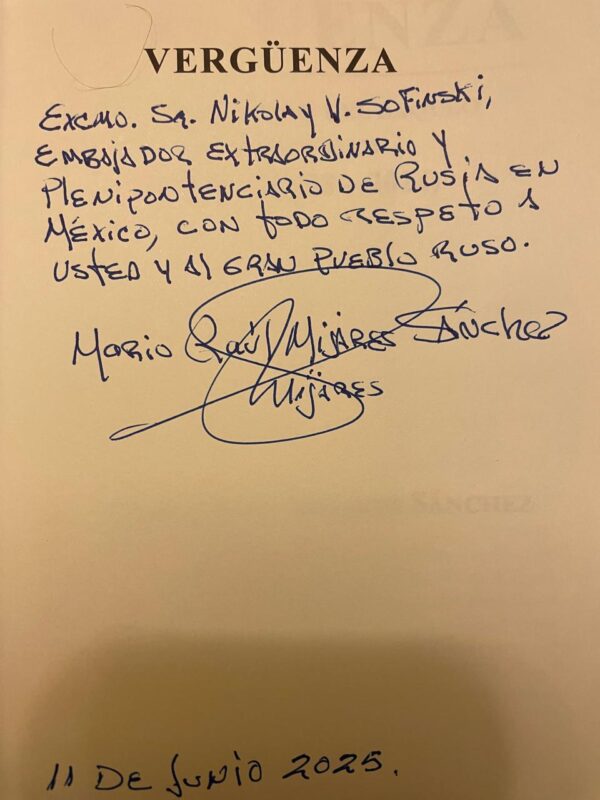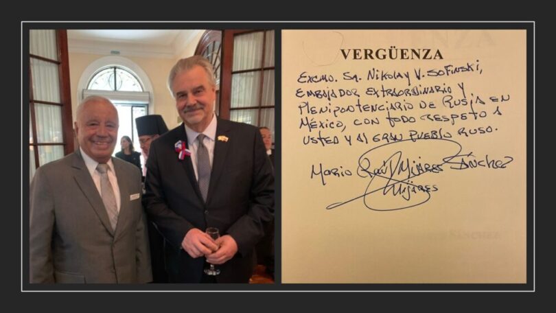 CDMX. 18/0672025.- En el marco de la conmemoración del Día Nacional de Rusia, el Dr. Mario Raúl Mijares Sánchez, Presidente del Instituto de Administración Pública de Veracruz (IAP Veracruz), fue invitado de honor a la ceremonia oficial celebrada en la sede de la Embajada de la Federación de Rusia en México. Durante el evento, su más reciente obra, “Vergüenza. Análisis Político del Saqueo y la Impunidad en Veracruz (1998-2024)”, fue entregada al Embajador Extraordinario y Plenipotenciario, Sr. Nikolay V. Sofinski.